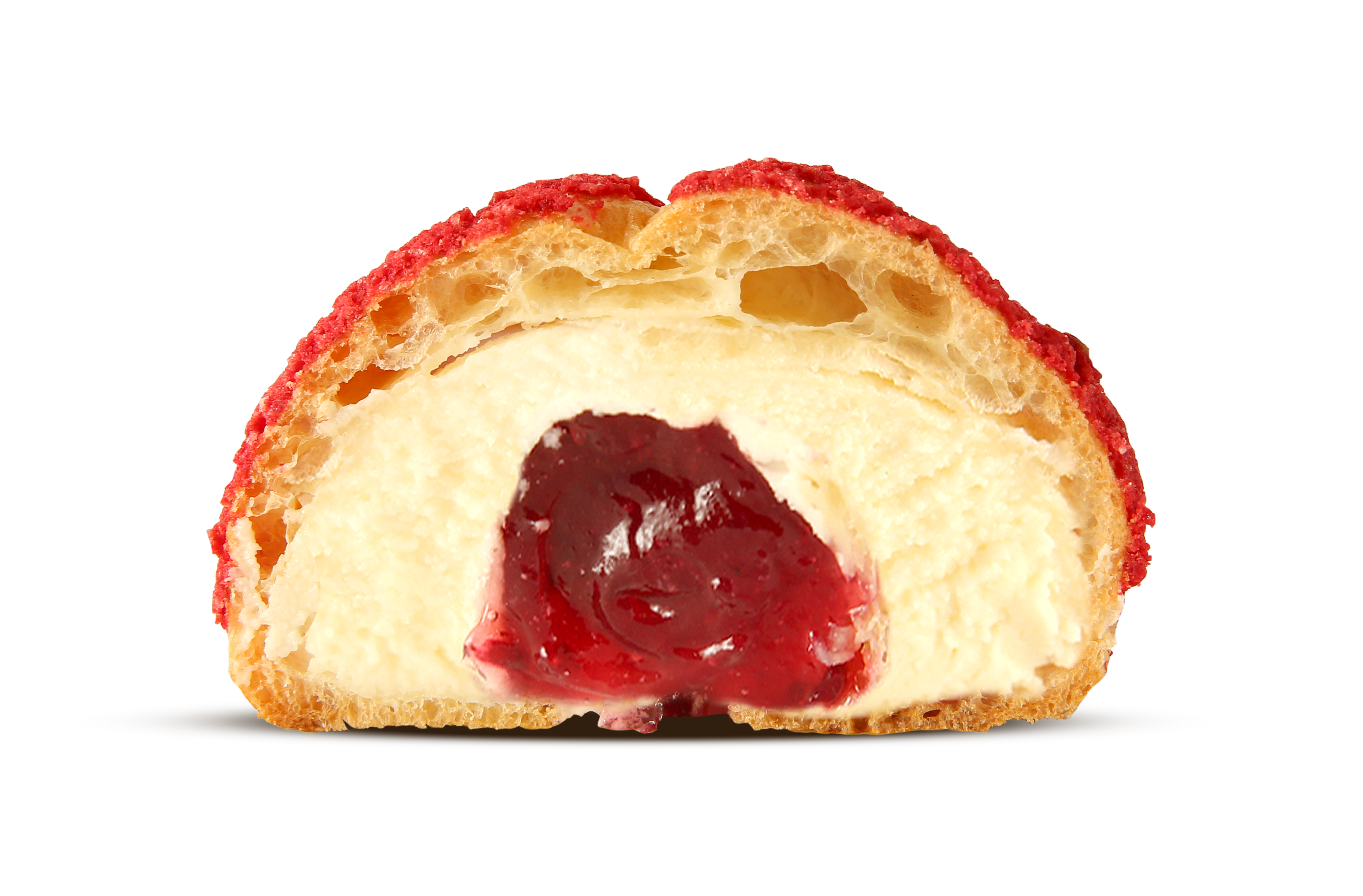 Лёгкое французское пирожное «Шу»— это выпечка из заварного теста, щедро наполненная заварным кремом на основе сливочного масла со вкусом ванили с малиновым конфитюром. Сверху пирожное украшено шапочкой из хрустящего кракелина.